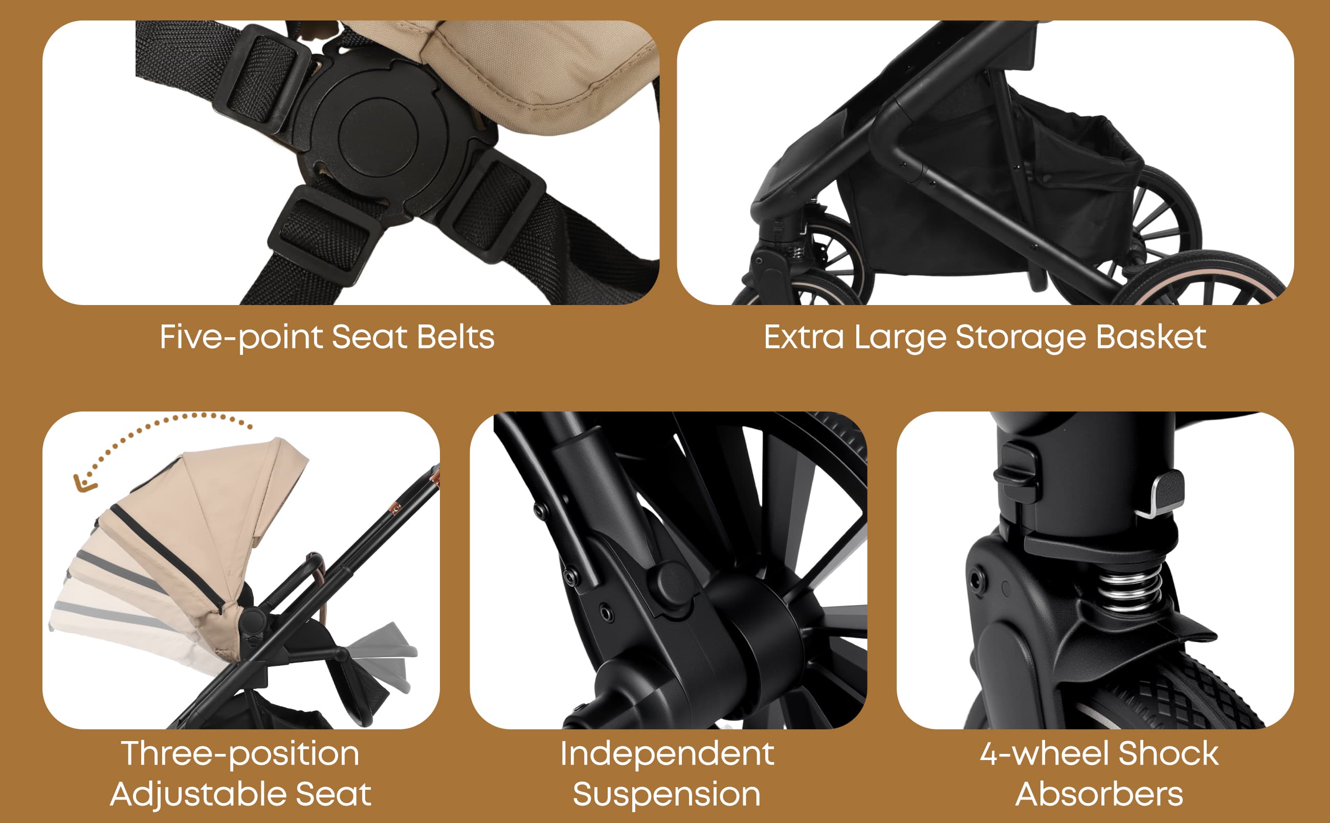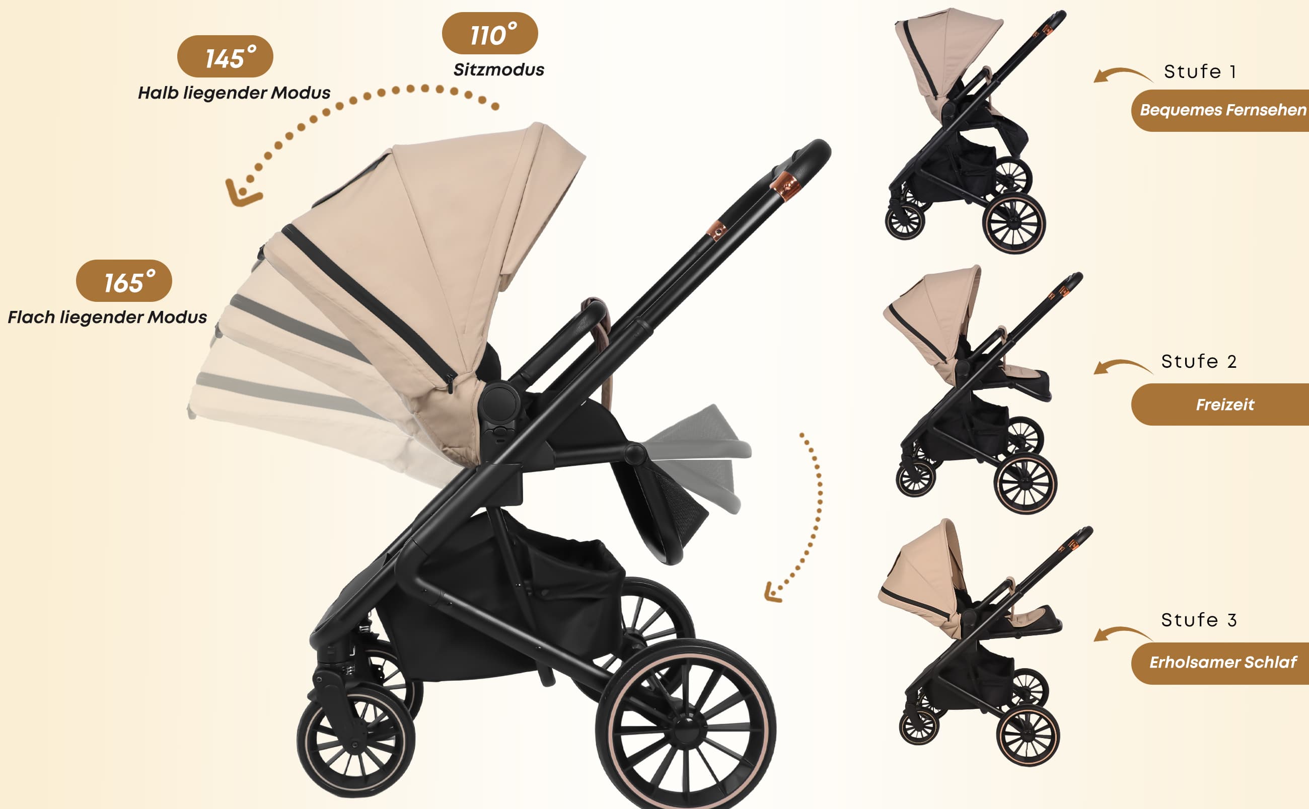 Rückenlehne mit 3 Positionen (Sitzen, Entspannen, Schlafen) + umkehrbarer Sitz – mit Blick zum Baby oder zur Welt zum Knüpfen von Bindungen und Erkunden.