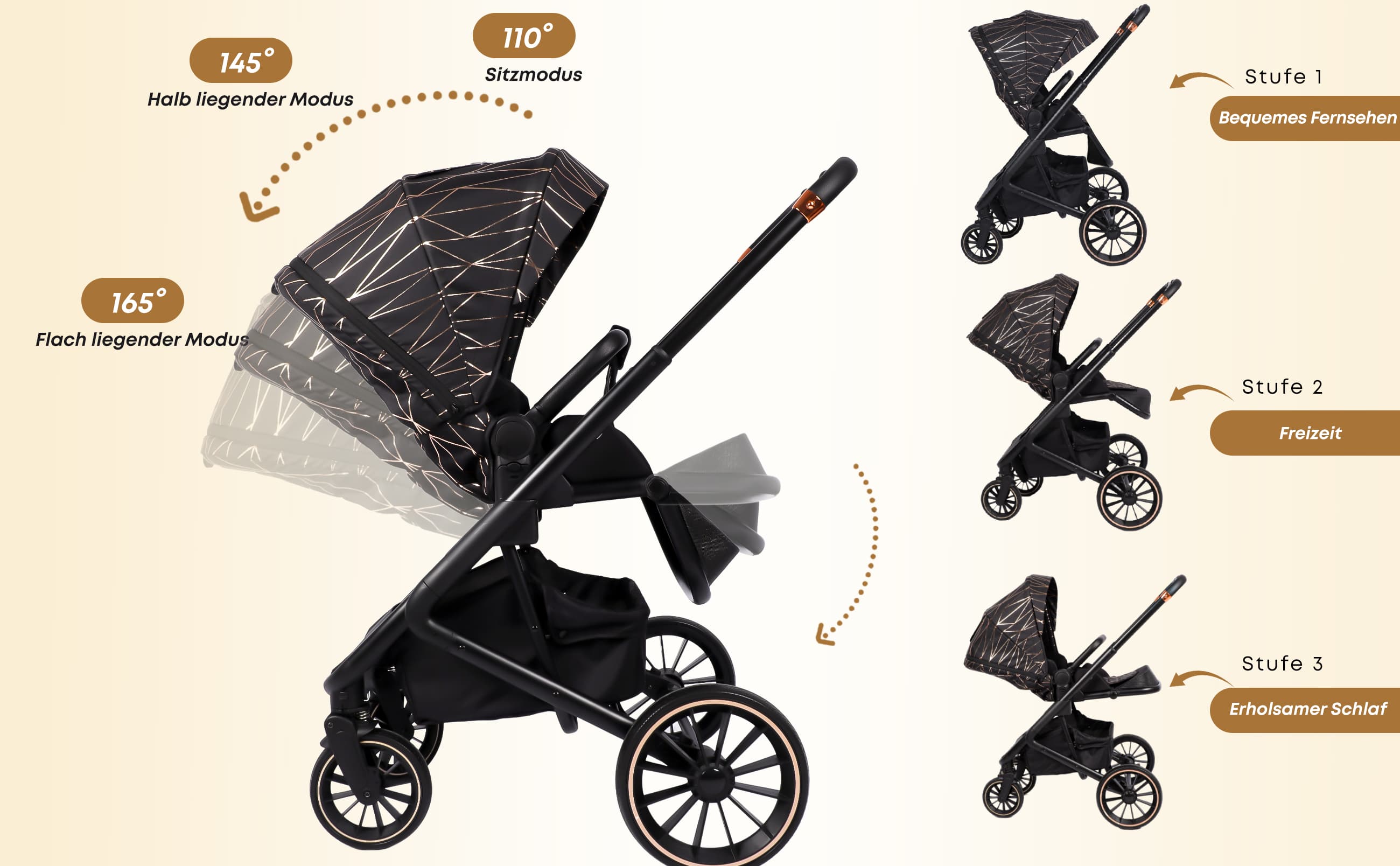 Rückenlehne mit 3 Positionen (Sitzen, Entspannen, Schlafen) + umkehrbarer Sitz – mit Blick zum Baby oder zur Welt zum Knüpfen von Bindungen und Erkunden.